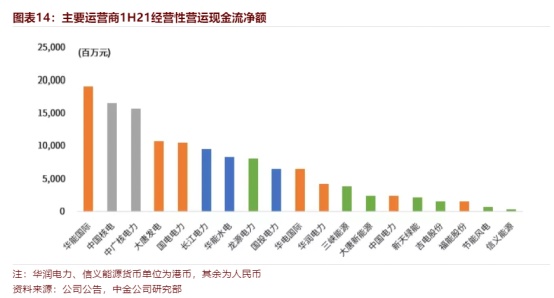 不仅如此,对于电力运营商而言,传统能源业务现金流充沛的企业,还能进一步开发新能源项目。例如华能国际、中国核电、中广核电力、大唐发电、国电电力等传统电力运营商现金流相对充沛,经营性营运现金流超过100亿元;长江电力、华能水电、国投电力等水电运营商现金流平均也在80亿元左右。