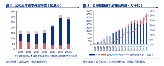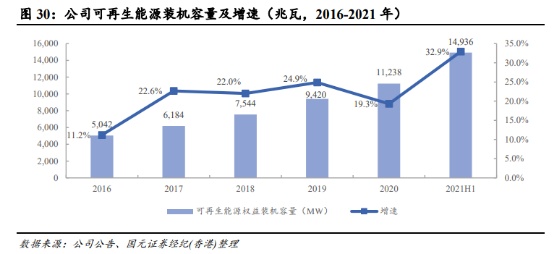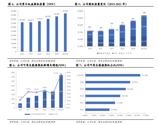 截至2021年6月30日,公司运营37座燃煤发电厂、3座燃气发电厂,火电运营权益装机容量为3212.7万千瓦,占比68.3%。公司发电厂的控股装机容量达到5918.6万千瓦,权益装机容量达4706.3万千瓦,较2020年底增长369.8万千瓦,其中火电权益装机容量为3212.7万千瓦;风电权益装机容量为1385.4万千瓦,较2020年底增长345.7万千瓦;光伏权益装机容量为80.3万千瓦,较2020年底增长24.1万千瓦。