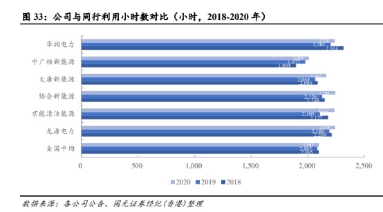 得益于风电项目布局的资源优势,公司风电利用小时数大幅超过全国平均水平,领先行业。2018-2020年,公司利用小时数分别为2314小时、2201小时和2236小时,分别超过全国平均219、119、139小时。与同行相比,公司风电利用小时数连续多年高于风电龙头企业龙源电力。