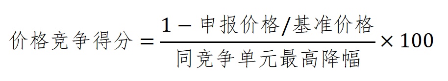 (1)价格竞争得分:申报企业按报价代表品进行价格申报,通过申报价格的降幅确定价格竞争得分。无效报价的申报企业价格竞争得分为“0”。具体计算公式为: