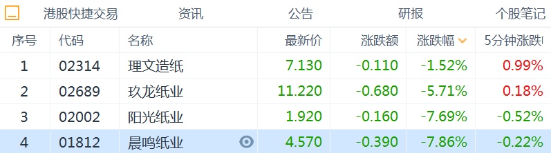 9月24日,港A市场纸业股集体下跌,其中A股市场的造纸板块仅有2只概念股上涨,其余皆呈下跌之势,港股纸业股则全线走绿,晨鸣纸业、阳光纸业皆跌超7%。