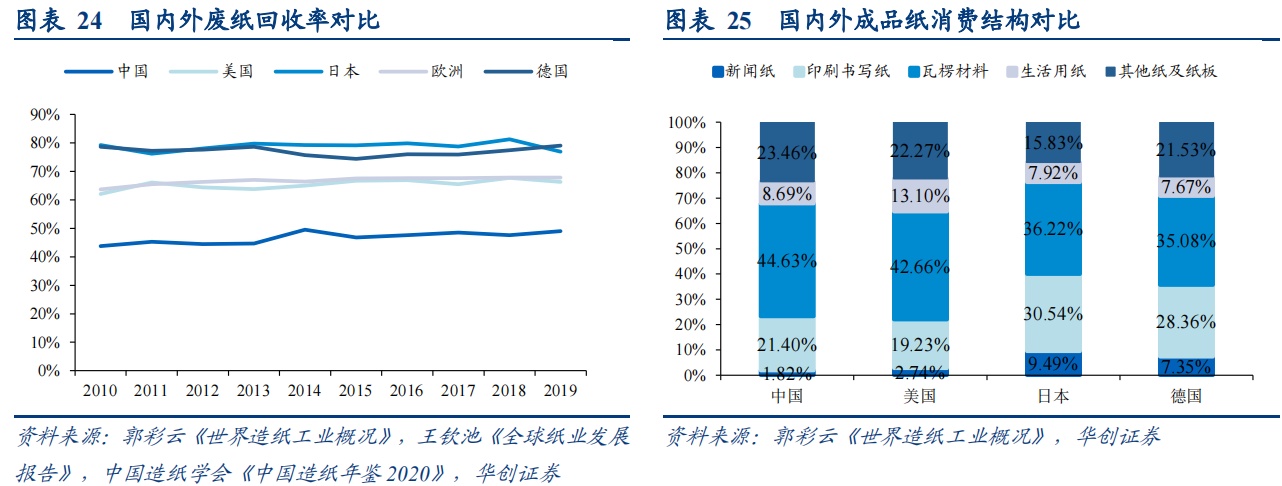 具体而言,长期以来,我国废纸回收率便低于日本、德国、美国等国家,在这其中,日本和德国的废纸回收率较高于美国,而美国则较高于我国。可以看到的一个明显差距的是,虽然我国和美国的成品纸消费结构类似,但历年废纸回收率却存有 15-20pct 之差。而由于提升废纸回收质量有利于缓解我国废纸原料不足的问题,因此“限废令”的出现也相当于间接地推动我国废纸回收率的提升。