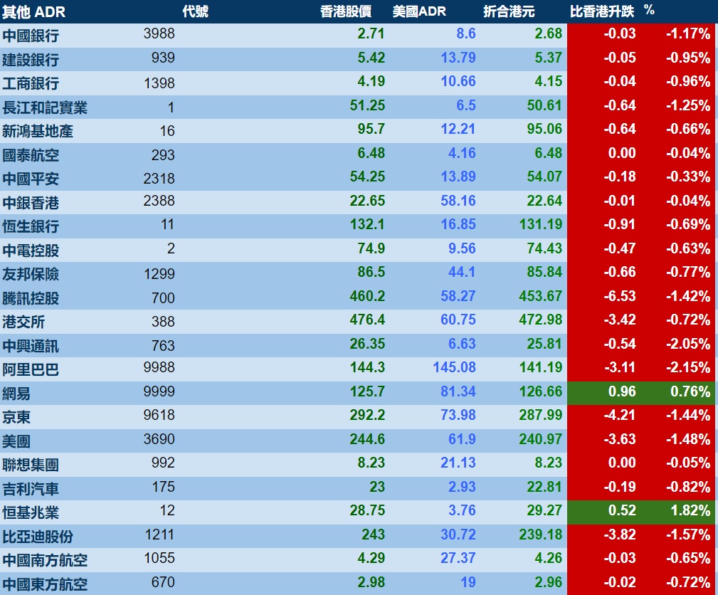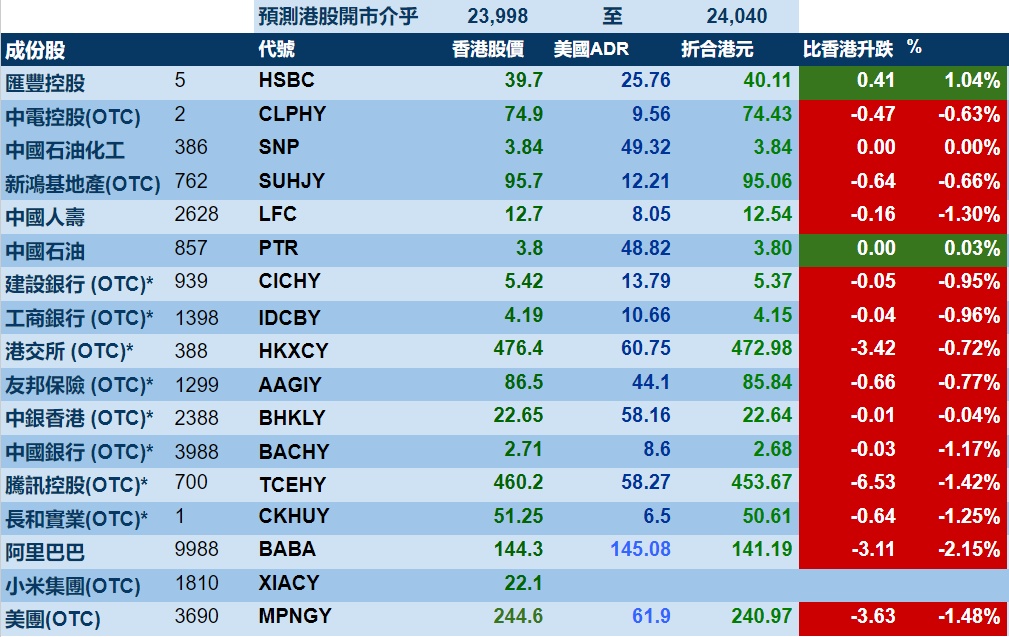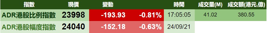 智通财经APP获悉,周五美股三大指数涨跌不一,港股ADR指数下跌,按比例计算,收报23998点,跌193.93点或0.81%。