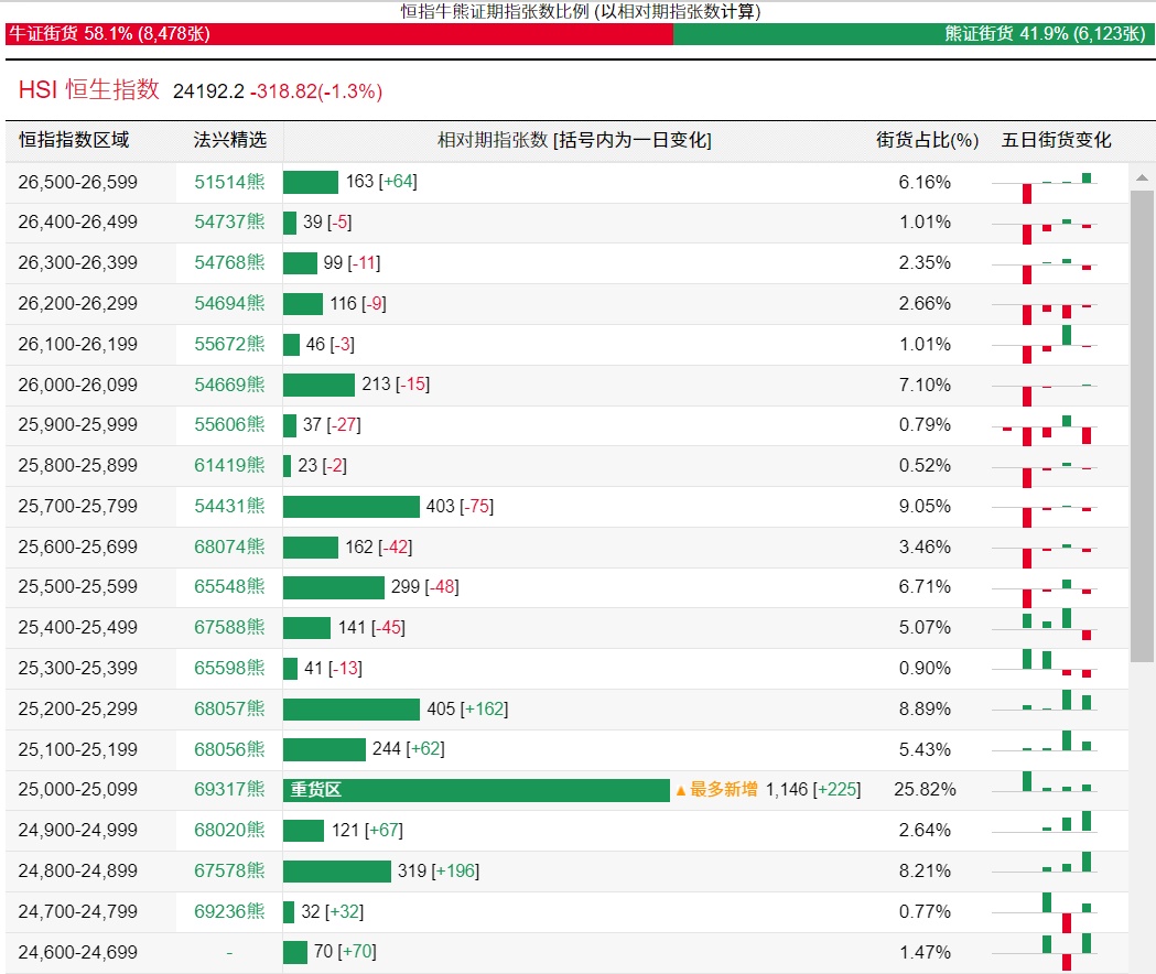 法兴恒指牛熊证街货分布图中的数据显示,熊证街货重货区在25,000-25,099区间,该区间最新熊证数量为1146张,较上一交易日增加225张;最多新增在相同区间。