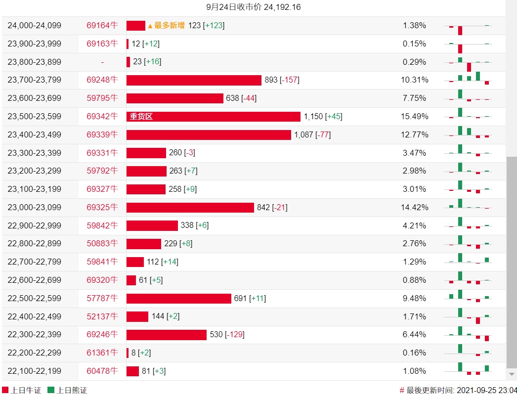 牛证街货重货区在23,500-23,599区间,该区间最新牛证数量为1,150张,较上一交易日增加45张;最多新增在24,000-24,099区间,该区间最新熊证数量为123张,较上一个交易日增加123张。