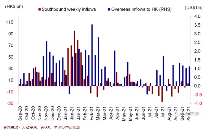 中秋节假期期间港股地产板块的剧烈波动引发市场明担忧情绪和大幅抛售,中资股市场走低。由于这一波动恰逢中秋假期国内市场休市,同时南向资金也暂停交易,使得港股市场更容易受外围情绪和环境的影响。根据我们与国内外投资者的交流情况,我们认为地产、保险和银行板块均一度遭受抛售所传递出海外投资者对出现系统性风险的担忧可能有些过度。其中的差异可能是由于明显的信息不对称所致,主要反映在以下几个方面:1)相关的问题已经持续发酵了一段时间,对国内市场来说并非是一个全新的话题,而海外市场最近的关注度才开始升温;2)政策方面在解决相关问题上有较为充足的应对手段和经验;3)国家多次声明守住不发生系统性金融风险是政策的底线。基于此,当市场逐步意识到可能并没有担心的那么严重后,港股市场和相关房地产股价在大幅抛售后出现了一定的反弹,南向资金周五大幅回流。