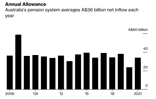 根据澳大利亚Prudential Regulation Authority的数据,包括投资回报在内,澳大利亚养老基金的总资产已膨胀至3.3万亿澳元(合2.4万亿美元),截至6月30日的一年中,养老基金净流入约340亿澳元。据毕马威预测,到本十年末,这个资金池可能会扩大到5.4万亿澳元。