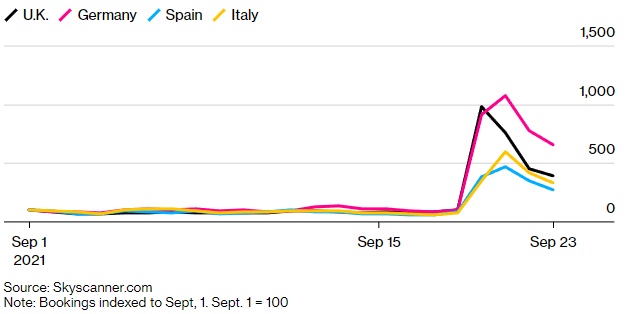 旅游业的其他领域也显示出好转的迹象。在英国9月17日表示将降低检测要求并简化国家风险排名后,旅游运营商TUI AG(TUIFY.US)三天内上涨了10%。预订软件供应商Amadeus IT Group SA(AMADY.US)、机场零售商WH Smith Plc和雅高酒店集团(ACCYY.US,Accor SA)等多家公司的股价最近都出现了反弹,不过这些股票仍远低于疫情前水平。