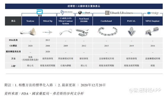 在全球范围内,目前已有7种TMV设备获得FDA/CE批准上市,其中只有雅培的MitraClip在中国获得了缘对缘TMVr的批准。其他批准用于TMV的设备包括Cardiac Dimensions的Catrillon、NeoChord的NeoChord DS1000、Edwards的Cardioband以及 PASCAL和Mitrallign的MPAS Implant。