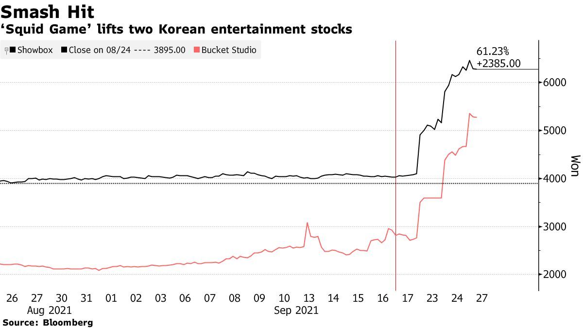 Bucket Studio Co.持有《鱿鱼游戏》男主角李政宰经纪公司的股份,在截至周一的三个交易日中,该公司股价在韩国股市飙升幅度最高近90%。Showbox Corp.股价同期涨幅超50%,该公司的前身曾投资于制作该剧的私人电视剧制作公司Siren Pictures。