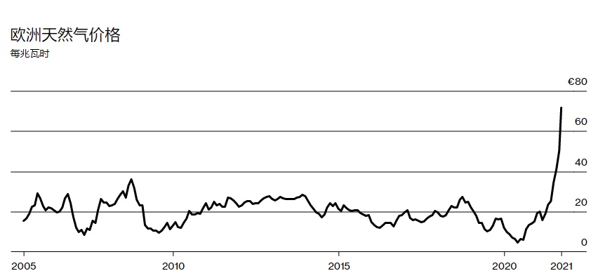 欧洲燃料库存处于每年这个时候的历史低点。来自俄罗斯和挪威的管输天然气受到了限制,比往年平静的天气减少了风力涡轮机的产量,同时欧洲老化的核电站正在被淘汰或停运,这使得天然气变得更加必要。导致欧洲天然气价格在过去的一年里飙升了近500%,并接近历史最高水平。