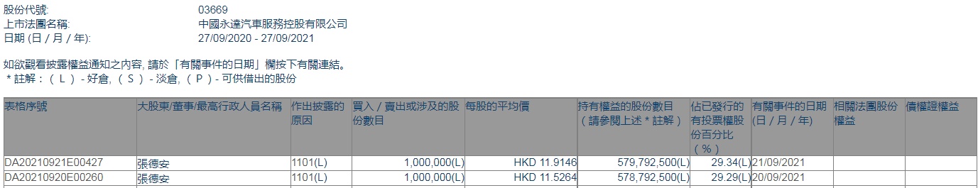 智通财经APP获悉,香港联交所最新资料显示,9月20-21日,董事长张德安均增持永达汽车(03669)100万股,每股作价分别为11.5264港元、11.9146港元,总金额为2344.1万港元。增持后最新持股数目约为5.8亿股,最新持股比例为29.34%。