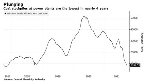 根据印度中央电力局的数据显示,煤炭库存已降至2017年11月以来的最低水平。目前,面临燃料危机的不仅仅只是印度,由于反弹的需求超过供应水平,包括英国在内等的国家都面临能源短缺。