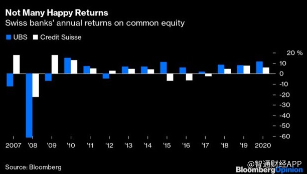 但现在情况早已截然相反。据数据投资,2010年以来,瑞信的股本回报率从未超过10%,2012年以来也从未超过瑞银。