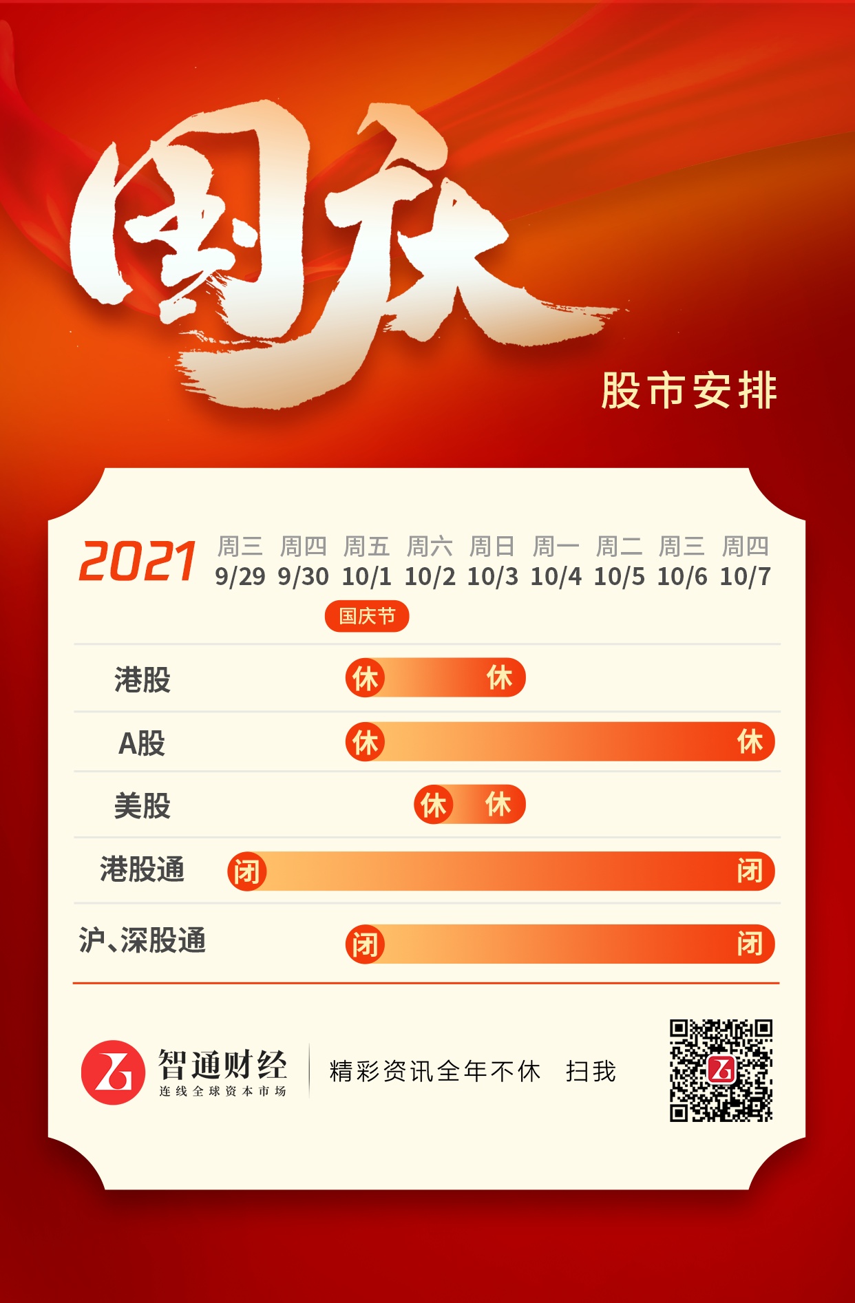 智通财经APP获悉,国庆节假期即将来临,股市的安排如下: