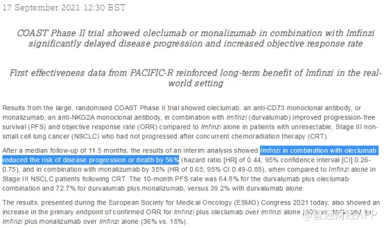 这项大型随机COAST II期试验结果显示,在同步放化疗(CRT)后未进展的不可切除的III期非小细胞肺癌(NSCLC)患者中,与单独使用IMFINZI比较,oleclumab(抗CD73单抗)或monalizumab(抗NKG2A单抗)与IMFINZI(durvalumab)联合使用显著提高了总响应率ORR并延长了无进展生存期PFS,ORR和10个月PFS都提高了近1倍。