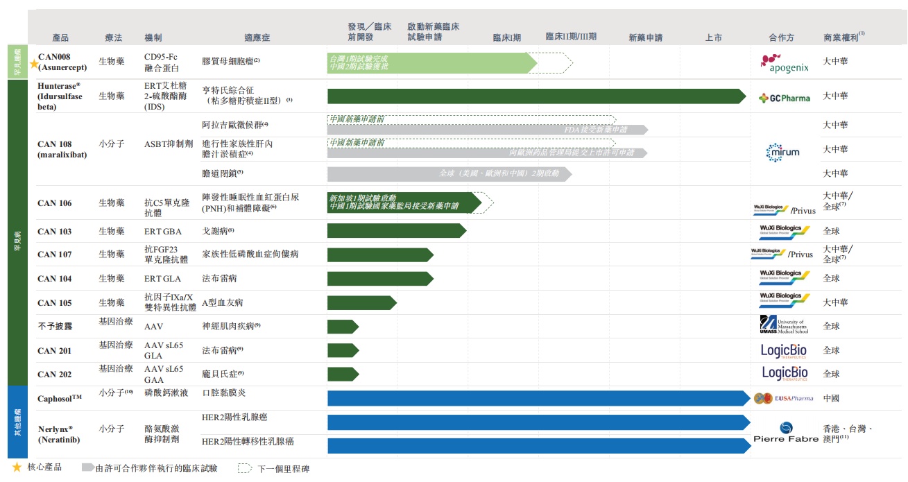 此外,北海康成于2019年1月从GC Pharma(或GC)授权引进Hunterase® (CAN101)。Hunterase® (CAN101)是一种用于治疗黏多糖贮积症II型(MPS II)的酶替代疗法,在全球10多个国家销售,并于2012年1月获得MFDS的孤儿药销售许可。截至目前,Hunterase® (CAN101)已获得阿尔及利亚、白俄罗斯、哈萨克斯坦和俄罗斯的销售许可,并已在巴西、埃及、印度、马来西亚、阿曼、土耳其及委内瑞拉批准作为用于治疗MPS II的处方药。Hunterase® (CAN101)也是目前中国唯一可用于MPS II的靶向治疗药物。