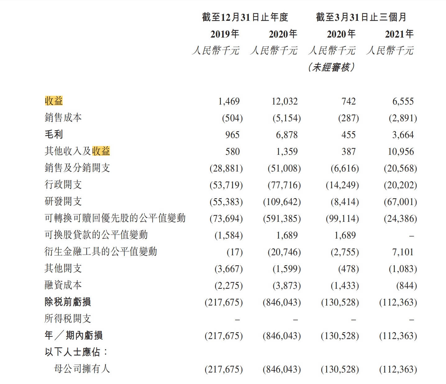 于2019年、2020年截至12月31日止及2020年、2021年截至3月31日止三个月,公司的总收益分别为人民币146.9万元、人民币1203.2万元及人民币74.2万元、人民币655.5万元。毛利润为人民币96.5万元、人民币687.8万元及人民币45.5万元、人民币366.4万元。研发费用分别为人民币5538.3万元、约人民币1.10亿元、人民币841.4万元及人民币6700.1万元。
