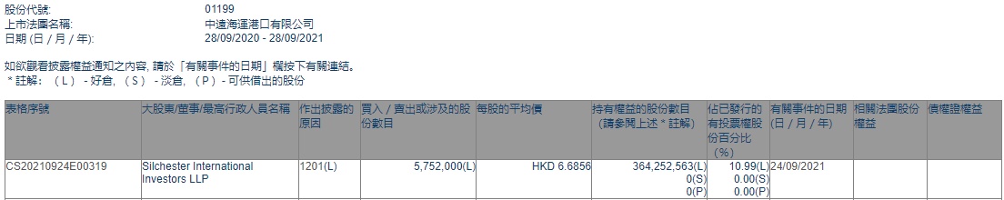 智通财经APP获悉,香港联交所最新资料显示,9月24日,Silchester International Investors LLP减持中远海运港口(01199)575.2万股,每股作价6.6856港元,总金额约为3845.56万港元。减持后最新持股数目约为3.64亿股,最新持股比例为10.99%。