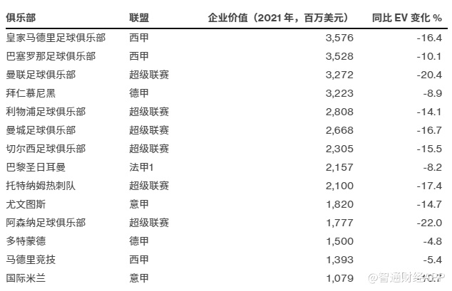 最有价值俱乐部排名和受疫情影响导致的估值变化: