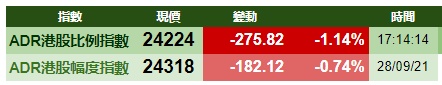 智通财经APP获悉,周二美股三大指数齐跌,港股ADR指数下跌,按比例计算,收报24224点,跌275.82点或1.14%。