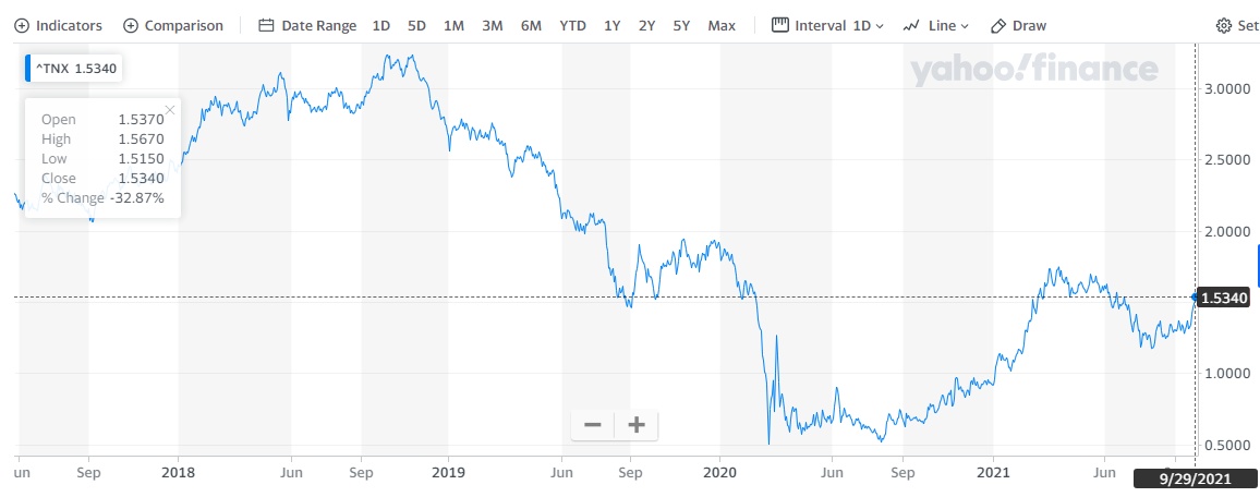 智通财经APP了解到,10年期美国国债收益率,目前已超过1.5%,处于三个月高点。在不到一周的时间里上涨了24个基点,较8月初的低点已经上涨超过40个基点。