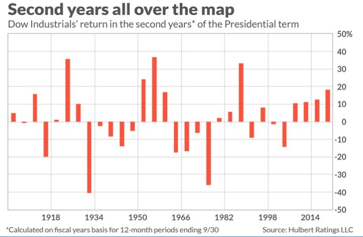 据统计,自1896年道琼斯工业平均指数(DJIA)创立以来,道指非选举周期第二年的平均纯价格回报率比周期第二年高出9个百分点以上。