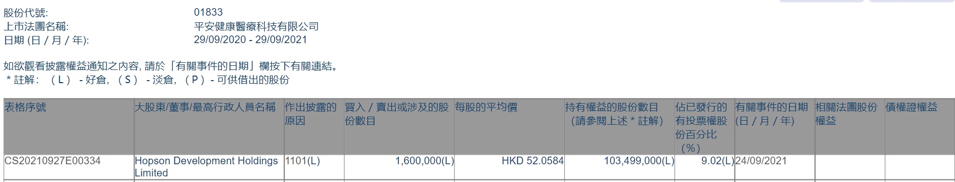 智通财经APP获悉,香港联交所最新资料显示,9月24日,Hopson Development Holdings Limited增持平安好医生(01833)160万股,每股作价52.0584港元,总金额为8329.3440万港元。增持后最新持股数目约为1.03亿股,最新持股比例为9.02%。