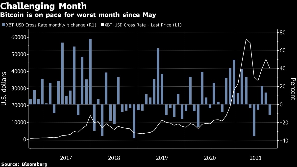 智通财经APP了解到,比特币价格本月累计下跌约12%,可能成为自5月份以来表现最差的一个月。