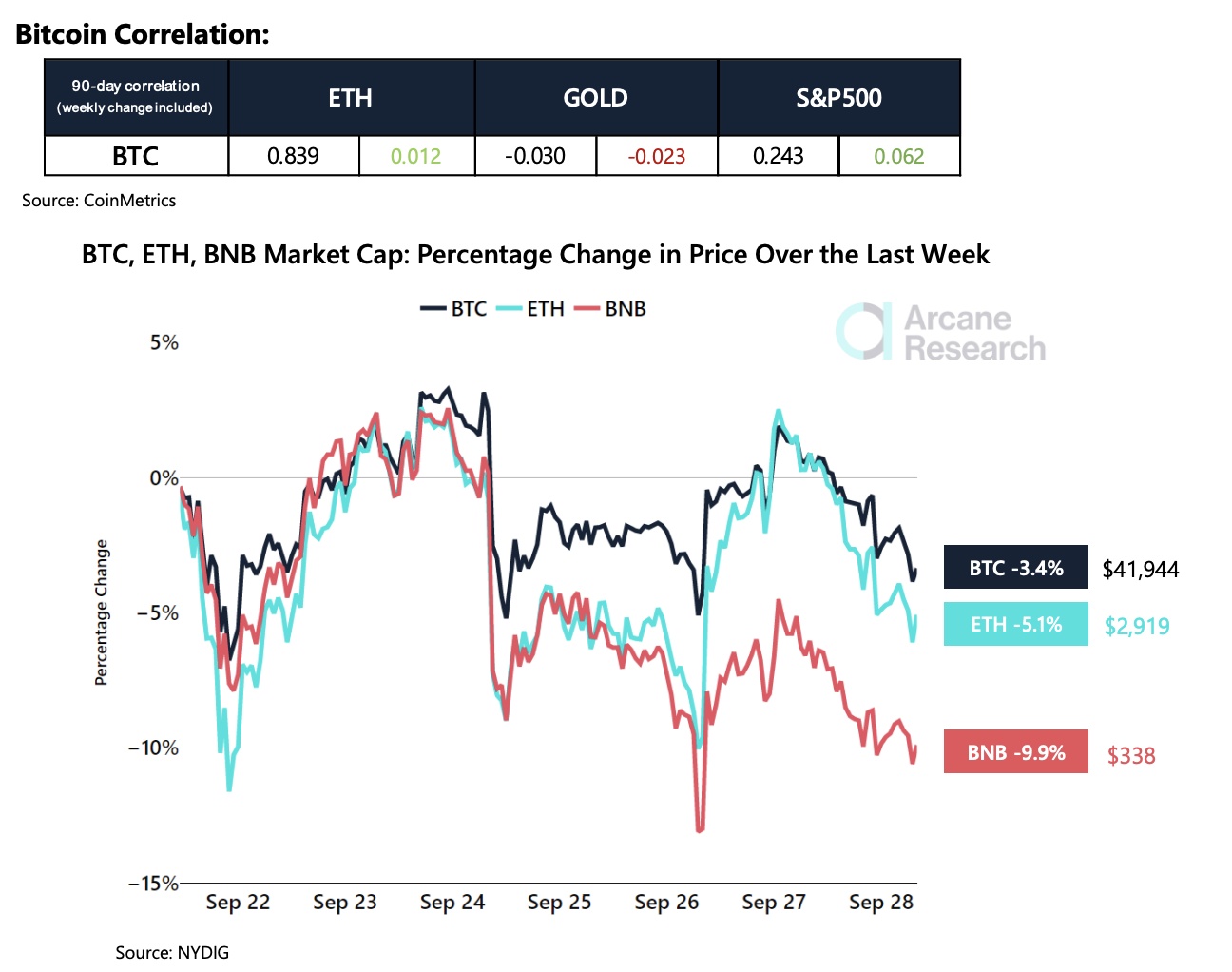 与此同时,美股也面临压力,9月可能是标普500指数表现最差的一个月。根据Arcane Research发布的一份报告,在最近市场风险偏好下行期间,加密货币与标普500指数的90日趋势相关性“显著增强”。