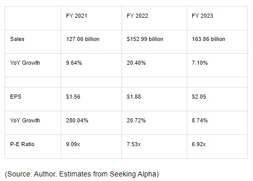 随着福特的电动汽车转型正在加速,该公司来自电动汽车业务的增长被低估了。福特预计,从2021财年到2025财年,每股收益将以每年8%的速度增长,到2022财年,每股收益将达到1.88美元。基于这一每股收益,福特目前的估值是预期收益的7.5倍。