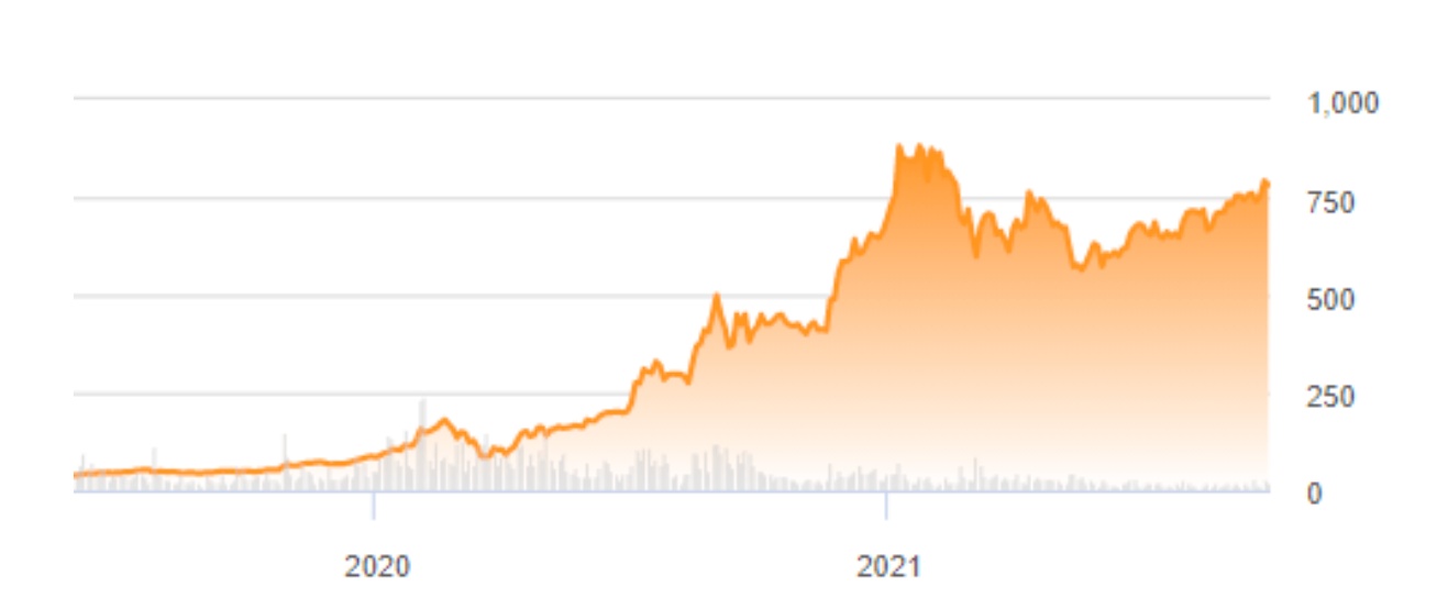 2020年,特斯拉大部分时间里大幅上涨,今年早些时候达到了900.40美元的52周高点。