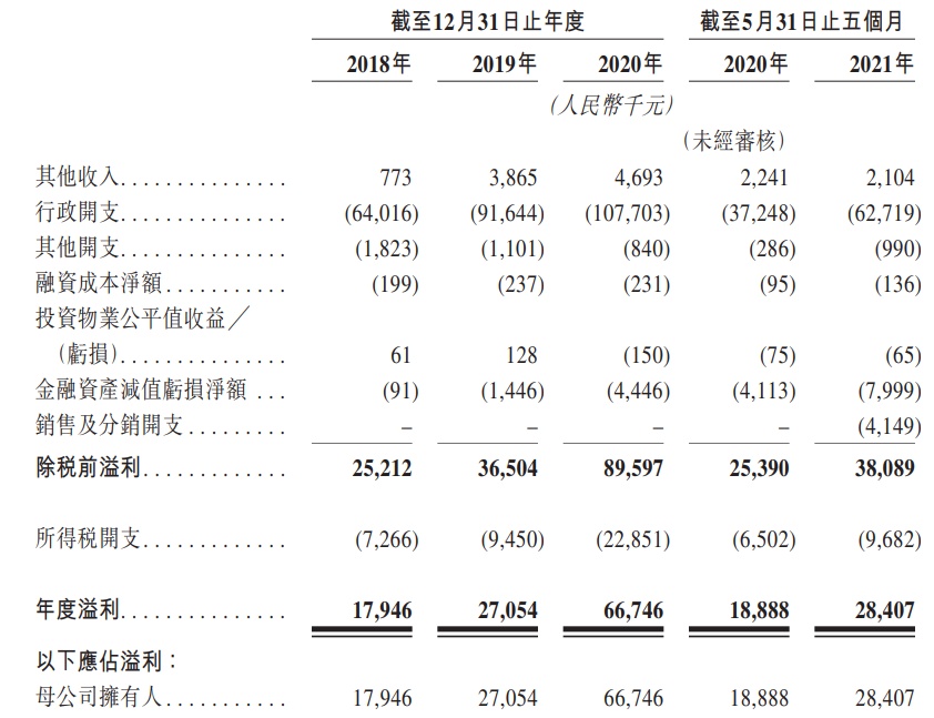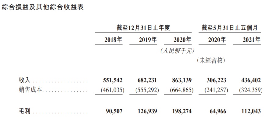 截至2018、2019年及2020年12月31日止年度以及截至2020年及2021年5月31日止五个月,公司的收入分别约为人民币5.52亿元、人民币6.82亿元、人民币8.63亿元、人民币3.06亿元、人民币4.36亿元。