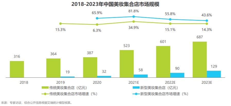 据艾瑞咨询报告显示,目前新型美妆集合店行业已由萌芽期逐步向稳定发展期过渡,行业市场规模呈迅速扩大之势——2020年国内新型美妆集合店占整体美妆集合店市场规模为7.6%,至2023年其市场份额占比有望提升至15.8%,市场规模预期将达到130亿元。