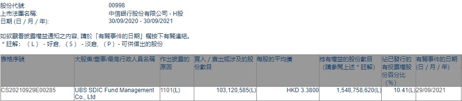 Ltd增持中信银行(00998)1.03亿股,每股作价3.38港元,总金额约为3.49亿港元。增持后最新持股数目约为15.49亿股,最新持股比例为10.41%。