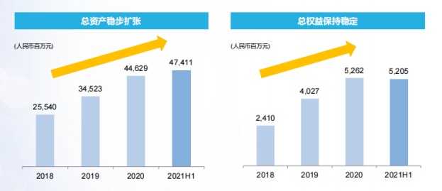 银城国际控股是快速增长的长三角品质房企,近年来一直践行“多元化”发展策略,逐步形成了以物业销售为主,项目管理、酒店营运、房地产投资、会展业务为辅的业务布局,整体规模稳步增长。截至2021年上半年,公司总资产稳定增长,约为474.1亿元(单位:人民币,下同),较2020年底增长约6.2% ;同期公司总权益约为52.0亿元,保持稳定水平。