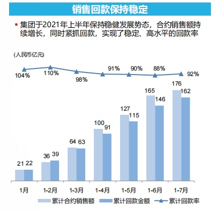 随着资管新规、“三道红线”和房贷集中度管理政策的相继落地,房企外源性融资渠道进一步收紧。在此背景下,力推物业快周转,加快销售回款和经营性现金流入,是中小房企缓释政策压力的重要手段和实现规模扩张的底气所在。2021年上半年,银城国际控股在合约销售金额持续增长的同时,亦保持了高水平的销售回款率,1-7月公司销售回款约162亿元,销售回款率高达92%。
