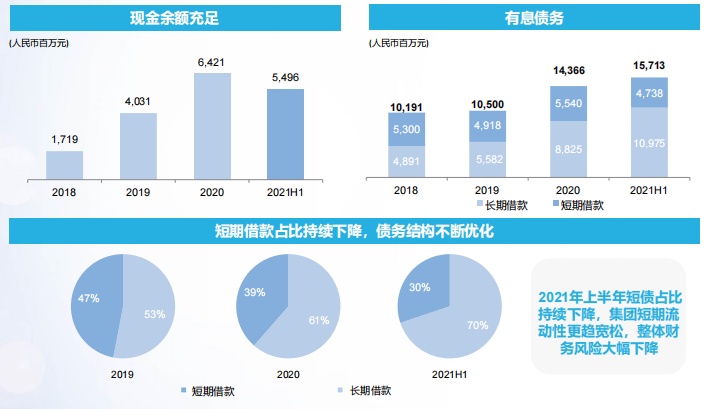 业务扎实推进背后,离不开健康的财务状况,银城国际控股的另一大亮点是短期借款占比持续下降,债务结构不断优化。2021年上半年,公司短期借款占比30%,同比下降9个百分点。短期流动性更趋宽松,整体财务风险大幅压降。同一时期,公司现金余额充足,达55亿元,未使用授信额度达119亿元。重要的是,2021年上半年,公司现金短债比保持稳定,为1.16倍,平均资金成本为7.5%,同比下降0.2个百分点,维持低位。充足的现金余额和未使用授信额度,将有力支撑银城国际控股未来发展需求。