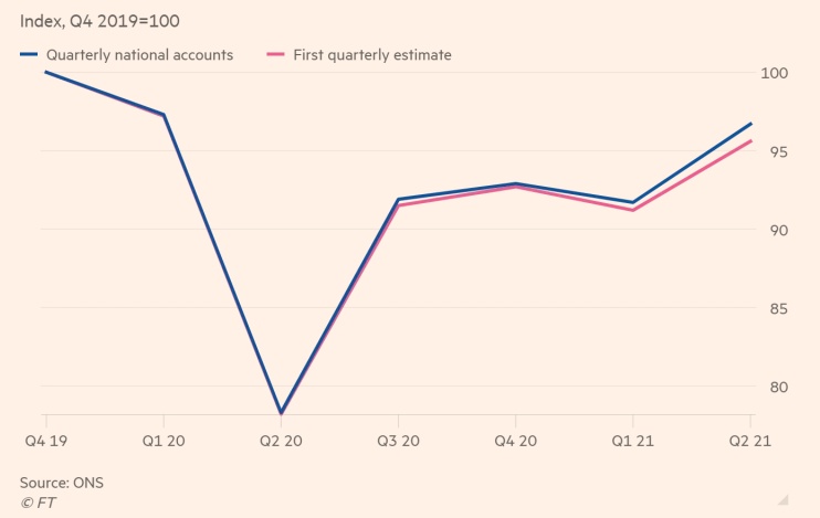 英国国家统计局公布的最新数据显示,第二季度英国国内生产总值(GDP)环比增长5.5%,而此前预计为4.8%。同时这也意味着该国经济水平目前比新冠疫情爆发前,也就是2019年第四季度的水平仅低3.3%。