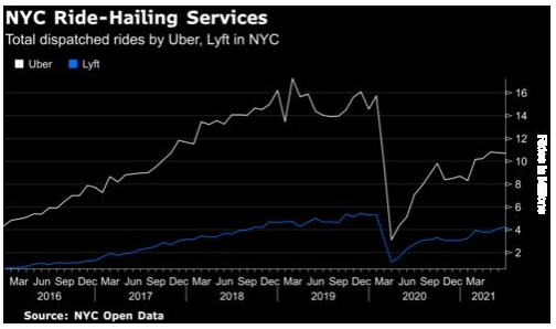 智通财经APP获悉,随着纽约市开始复苏,人们通过优步(UBER.US)和Lyft(LYFT.US)这些网约车平台打车的数量大幅上升,但仍低于疫情前的水平。数据显示,今年截至7月,优步的订单量同比增长了16%,Lyf订单量同比增长了21%。此外,纽约市的交通数据显示了类似的趋势,即随着越来越多人通勤到纽约,纽约交通渐渐恢复到接近疫情前的水平。