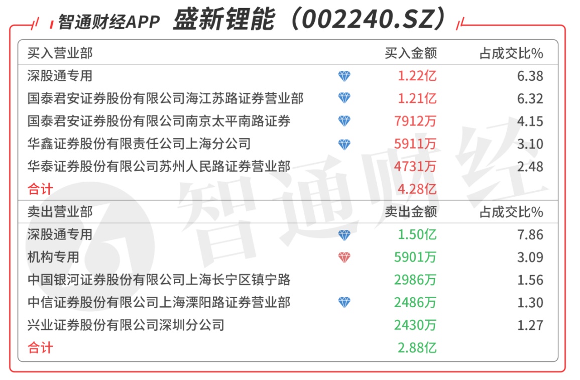盛新锂能(002240.SZ):龙虎榜阵容强大,深股通对倒,今日共四个一线游资席位出现在龙虎榜单上,分别列买二、买三、买四,买五,其中买二是知名游资章盟主的席位买入1.21亿元,买三是知名游资作手新一的席位买入7912万元,合计买入2.24亿元,机构席位今日卖出5901万元,当日净买入1.22亿元,该股近期调整充分,今日强势涨停板,要突破20日线,需要进一步放量。