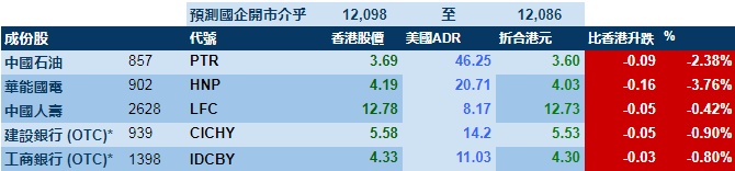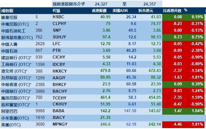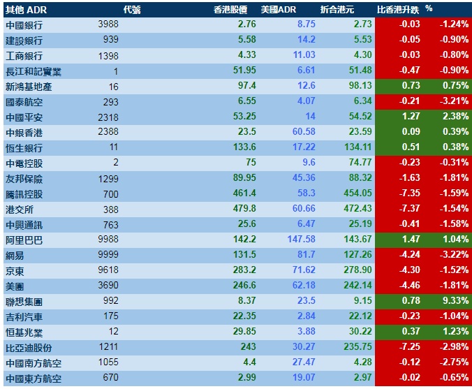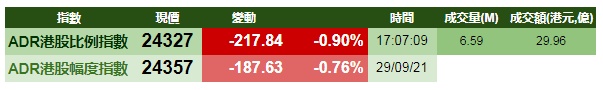 智通财经APP获悉,周四美股三大指数齐跌,港股ADR指数下跌,按比例计算,收报24327点,跌217.84点或0.9%。