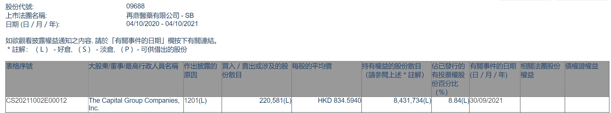 智通财经APP获悉,香港联交所最新资料显示,9月30日,The Capital Group Companies, Inc.减持再鼎医药(09688)22万股,每股作价834.594港元,总金额约为1.84亿港元。减持后最新持股数目约为843.2万股,最新持股比例为8.84%。