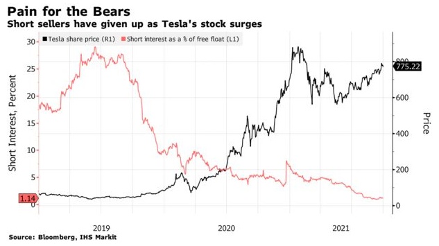 智通财经APP获悉,自3月份触及2021年低点以来,特斯拉股价已上涨38%,导致做空者急于回补其空头头寸。据IHS Markit Ltd.的数据显示,截至上周四,交易员借入股票占该股可供交易股票的比例(一种衡量做空利率的标准指标)已降至1.1%。这是自2010年特斯拉上市以来的最低水平。
