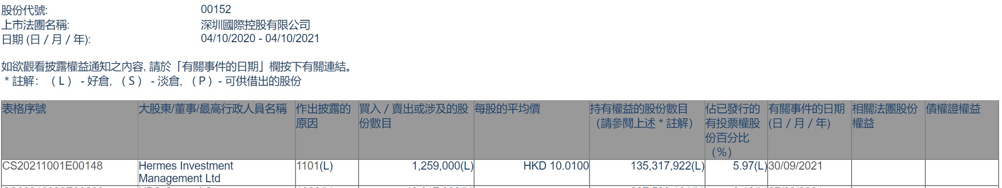 智通财经APP获悉,香港联交所最新资料显示,9月30日,Hermes Investment Management Ltd增持深圳国际(00152)125.9万股,每股作价10.01港元,总金额约为1260.26万港元。增持后最新持股数目约为1.35亿股,最新持股比例为5.97%。