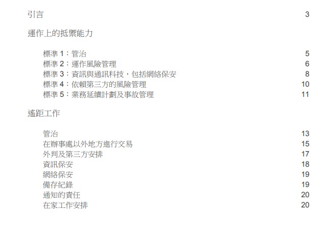 报告中,关于持牌机构运作上的抵御能力,列出了管治、运作风险管理、资讯与通讯科技(包括网络安全)、依赖第三方的风险管理、业务延续计划及事故管理等5个方面的监管标准;关于远程工作,就管治、在办事处以外地方进行交易、外判及第三方安排、资讯安全、网络安全、备存纪录、通知的责任、在家工作安排等方面明确了监管标准。