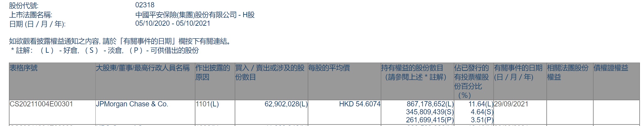 智通财经APP获悉,香港联交所最新资料显示,9月29日,小摩增持中国平安(02318)约6290.2万股,每股作价54.6074港元,总金额约为34.35亿港元。增持后最新好仓持股数目约为8.67亿股,最新好仓持股比例为11.64%。