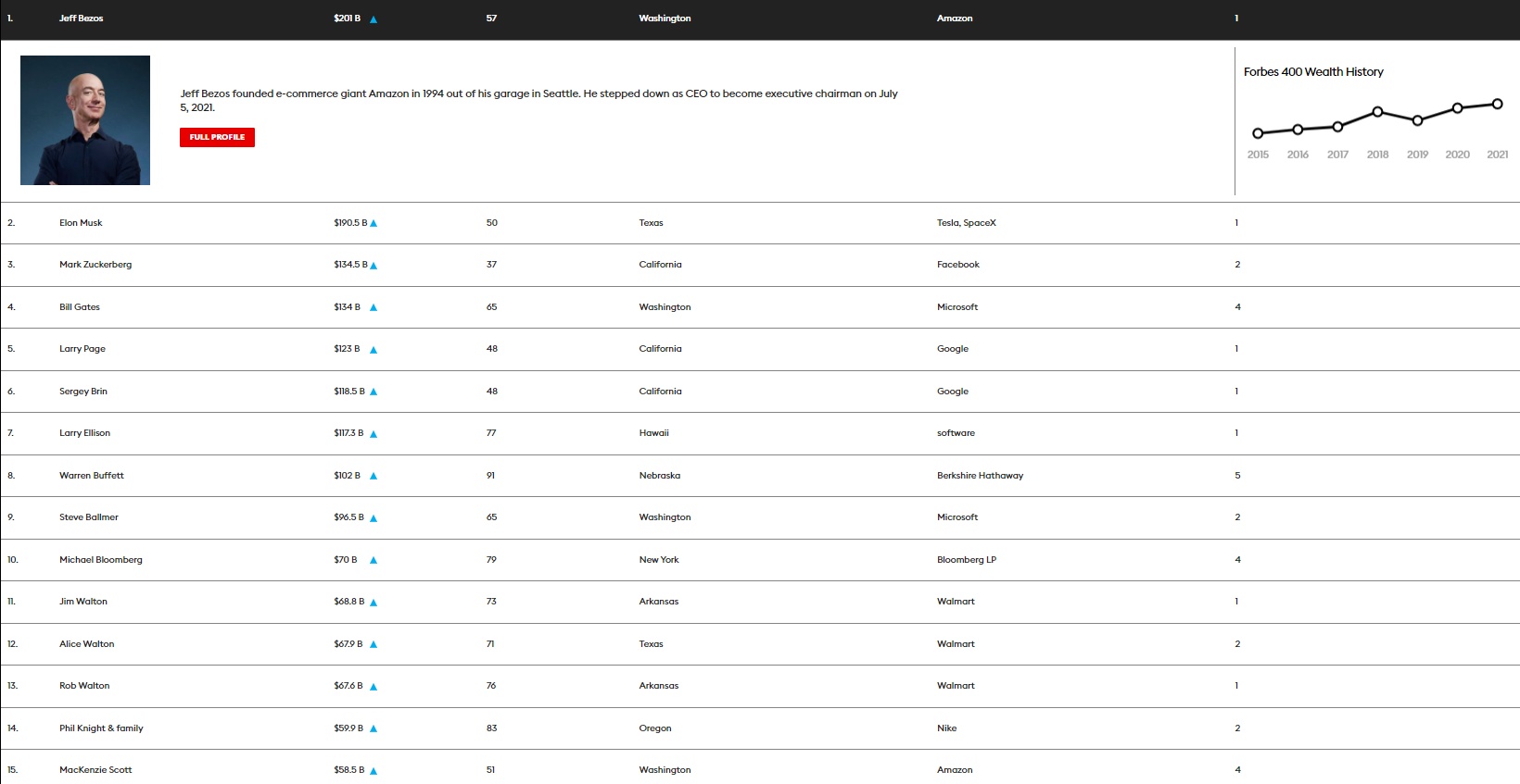 智通财经APP获悉,福布斯发布了最新的2021年度美国富豪榜,其中,贝索斯居首,黑石(BX.US)苏世民、华纳音乐(WMG.US)老板挤进前20。