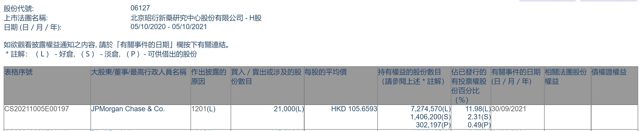 智通财经APP获悉,香港联交所最新资料显示,9月30日,小摩减持昭衍新药(06127)2.1万股,每股作价105.6593港元,总金额约为221.88万港元。减持后最新好仓持股数目约为727.46万股,最新好仓持股比例为11.98%。