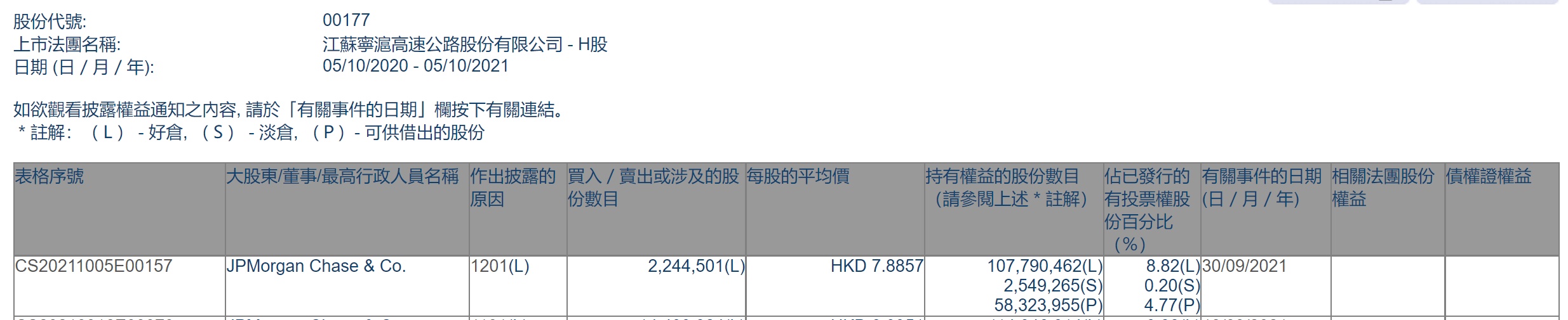 智通财经APP获悉,香港联交所最新资料显示,9月30日,小摩减持江苏宁沪高速公路(00177)约224.45万股,每股作价7.8857港元,总金额约为1769.95万港元。减持后最新好仓持股数目约为1.08亿股,最新好仓持股比例为8.82%。